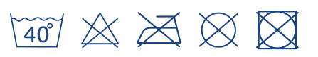 Lavaggio: a 40°C con detergenti neutri, a mano o in lavatrice.  Utilizzare abbondanti volumi d’acqua.
