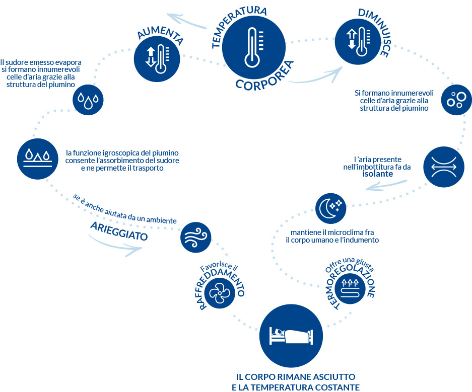 Questo schema evidenzia come cambiano funzione ed utilità del piumino d’oca al variare della temperatura corporea: